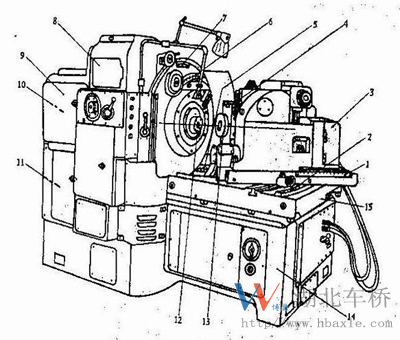 1、水平輪位 2、安裝角 3、分度掛輪 4、垂直輪位 5、床位 6、刀位 7、搖臺(tái)角 8、滾切修正機(jī)構(gòu) 9、進(jìn)給掛輪 10、切速掛輪 11、滾比掛輪 12、刀盤主軸 13、工件主軸 14、床身 15、床鞍