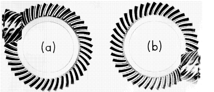 零度錐齒輪(圖2)就是螺旋角為零度的弧齒錐齒輪,彎曲的輪齒向直齒錐齒輪一樣處于相同的方向上。和弧齒錐齒輪一樣,在軸承上產(chǎn)生相同的推力載荷,可以用于相同的安裝,具有平滑的運轉特性,可以在同一臺機床上制造。零度錐齒輪也可以進行齒面的精密加工。有時螺旋角小于10度的弧齒錐齒輪都稱為零度錐齒輪。