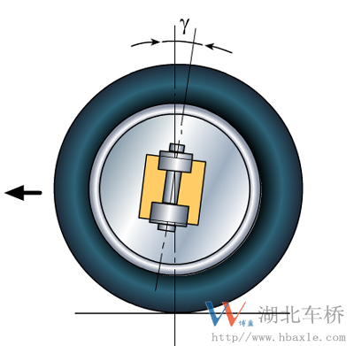 在車輪的縱向平面內,前橋主銷上部向后傾斜一個γ角稱為主銷后傾角。一般取γ為2°~3°