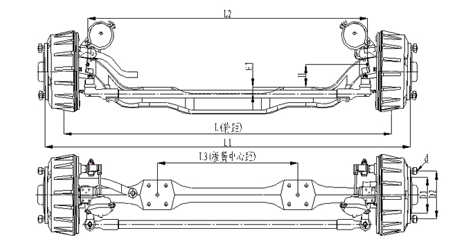 1.前軸為整體鍛造結(jié)構(gòu),采用加強設(shè)計,承載能力強; 2.車輪輪輞定位方式可采用球面定位或止口定位;3.輪距、板簧距可靈活調(diào)整;