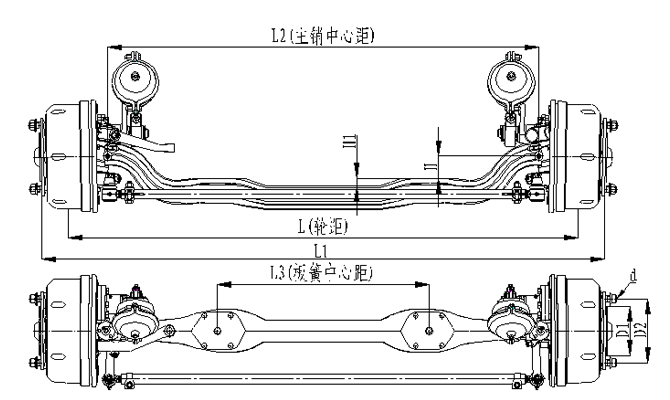1.前軸為整體鍛造結(jié)構(gòu),采用加強設計,承載能力強;2.輪距、板簧距可靈活調(diào)整